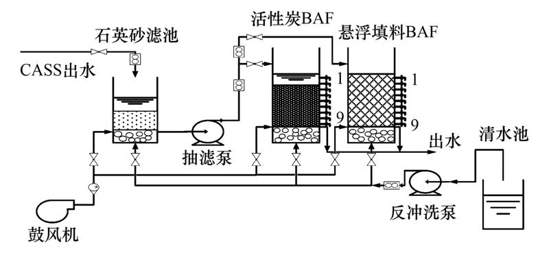 兩套曝氣生物濾池試驗裝置如圖 1所示,該污水處理廠生化處理采用CASS工藝,CASS出水經潛水泵打入前端石英砂濾池,去除懸浮物質以方便準確進行沿程試驗研究,同時減少后續BAF處理負荷和減緩反沖洗頻率. 再經抽濾泵抽吸,均以15 t ·d-1的流量并聯流入活性炭BAF和懸浮填料BAF,水力停留時間分別為1 h和2 h,溶解氧均控制在4 mg ·L-1左右. *后經過兩套BAF處理排出. 濾池反沖洗采用“氣沖 (氣沖+水沖) 水漂洗”的方式. 先氣沖10 min,再氣水聯合沖洗10 min,*后水漂洗5 min的方式. 中試裝置從10月下旬至次年1月中旬連續通水運行80 d. 運行前30 d視為掛膜啟動階段. 第31 d開始連續監測出水水質,評估BAF沿高程的凈化效果,沿程試驗期間水溫為15~20℃.