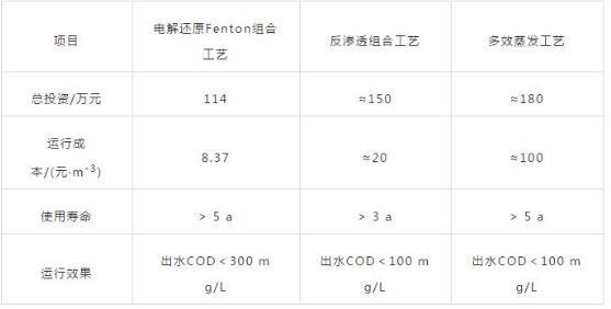由表3可知,盡管反滲透與多效蒸發工藝處理出水COD更低,但投資、運行成本均高于電解還原Fenton組合工藝,經實踐證明采用電解還原Fenton組合工藝是經濟合理的。