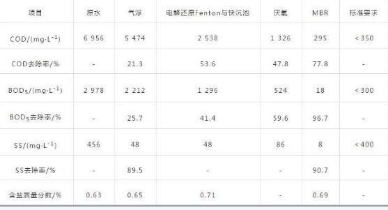 調試初期,對電解還原Fenton工藝的反應電壓、電流及加藥量進行了調試,對厭氧池采用接種化糞池污泥進行接種,對MBR裝置采用洞頭區市政污水處理廠污泥濃縮池的污泥進行接種。經過近半年的試運行,采用該組合工藝處理該廢水,氣浮池、電解還原Fenton、厭氧及MBR設計COD去除率分別為25%、50%、65%、70%。具體進、出水水質及各工藝段去除率見表2。
