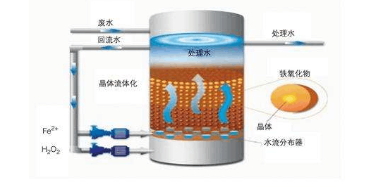 1893年,化學(xué)家Fenton HJ發(fā)現(xiàn),過氧化氫(H2O2)與二價鐵離子的混合溶液具有強氧化性,可以將當(dāng)時很多已知的有機化合物如羧酸、醇、酯類氧化為無機態(tài),氧化效果十分顯著。但此后半個多世紀中,這種氧化性試劑卻因為氧化性極強沒有被太多重視。但進入20 世紀70 年代,芬頓試劑在環(huán)境化學(xué)中找到了它的位置,具有去除難降解有機污染物的高能力的芬頓試劑,在印染廢水、含油廢水、含酚廢水、焦化廢水、含硝基苯廢水、二苯胺廢水等廢水處理中體現(xiàn)了很廣泛的應(yīng)用。 當(dāng)芬頓發(fā)現(xiàn)芬頓試劑時,尚不清楚過氧化氫與二價鐵離子反應(yīng)到底生成了什么氧化劑具有如此強的氧化能力。二十多年后,有人假設(shè)可能反應(yīng)中產(chǎn)生了羥基自由基,否則,氧化性不會有如此強。因此,以后人們采用了一個較廣泛引用的化學(xué)反應(yīng)方程式來描述芬頓試劑中發(fā)生的化學(xué)反應(yīng):